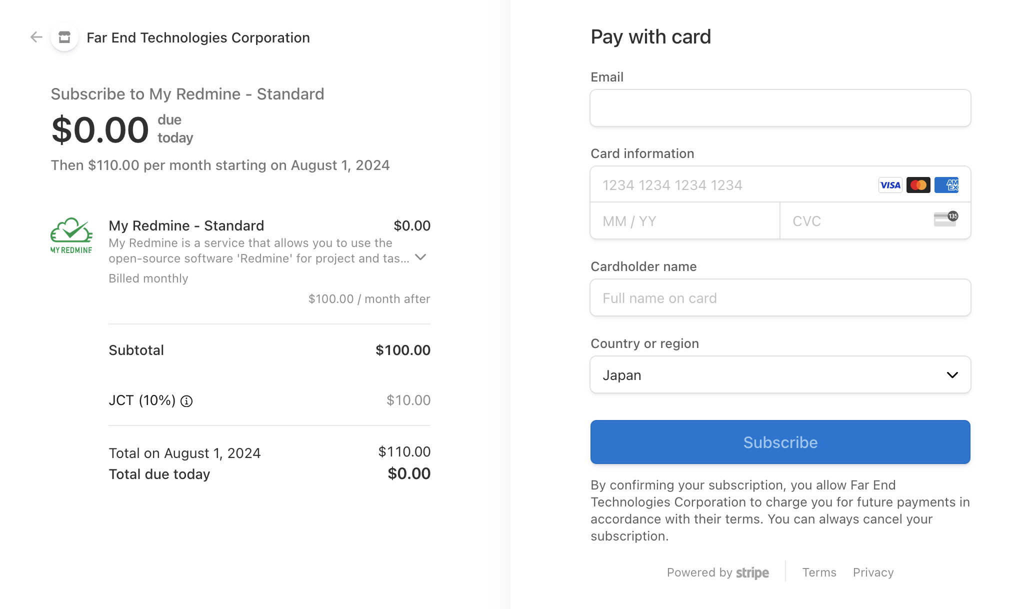 Ready to sign up? Head over to “Administration > My Redmine Payment” and follow the steps to subscribe. Currently, we only accept credit card payments. Just enter your name, address, and credit card information to get started.